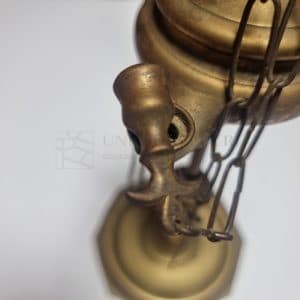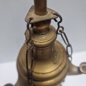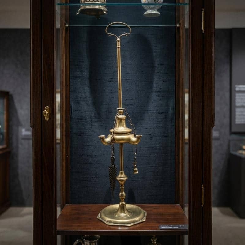 "Nota bene: L'opera pittorica inserita è l'esatto dipinto originale in vendita. L'unica differenza risiede nella cornice, che in questo concept d'interni ha scopo puramente indicativo e differisce da quella autentica." A corredare e completare il dipinto, viene fornita l'esatta e autentica Lucerna in ottone del XIX secolo (Fine Ottocento) appartenuta all'artista e meticolosamente ritratta nel quadro. Questa lucerna ad olio, oltre a vantare una meravigliosa e calda patina del tempo, è conservata in condizioni museali: alle sue catenelle originali pendono ancora gli iconici strumenti di pulizia per i beccucci, tra cui lo smoccolatoio a forbice e lo spegnitoio a campanella, fedelmente riprodotti dal pennello dell'artista quasi 50 anni fa.